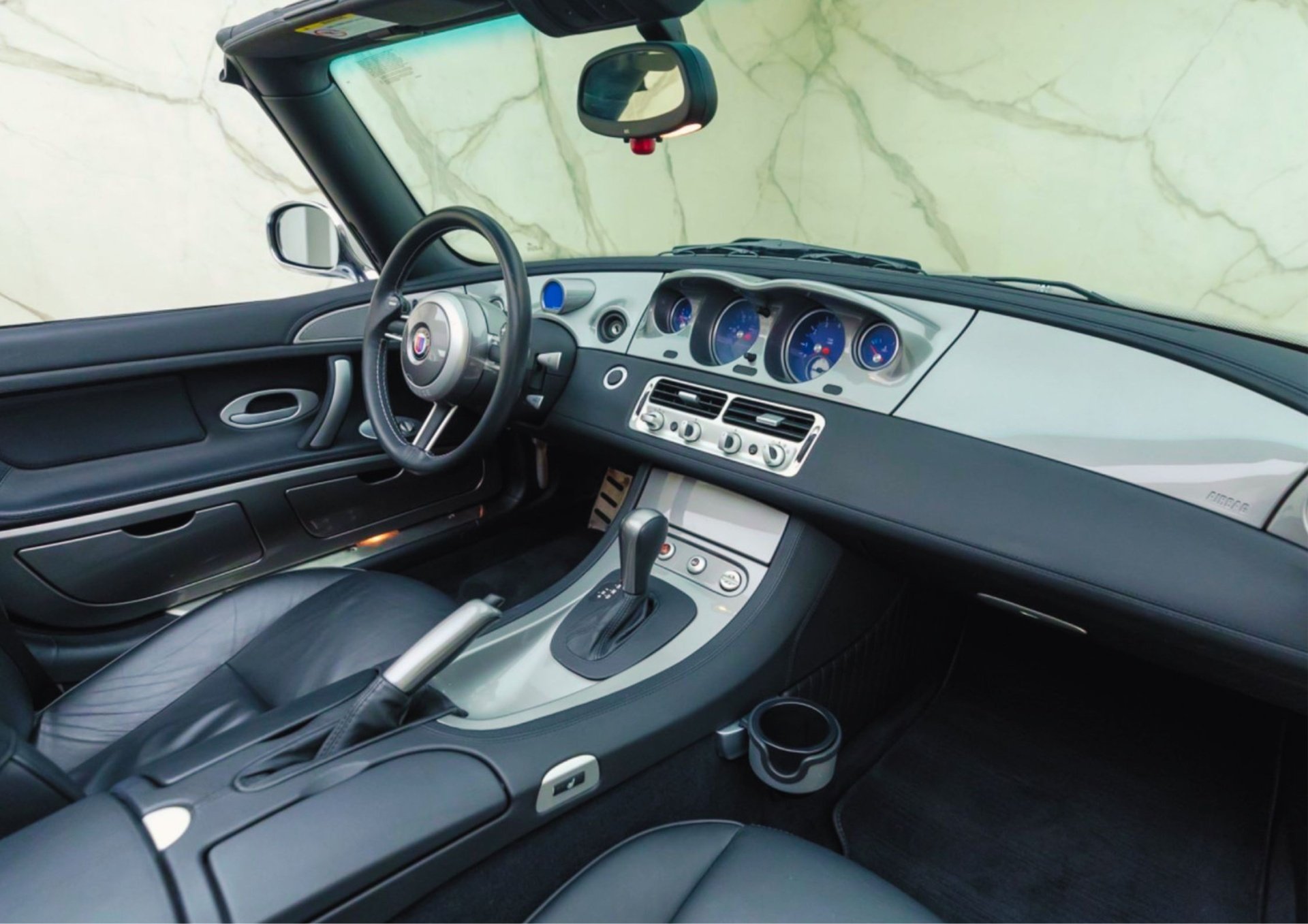 Step inside the Alpina Roadster V8 and the differences from the standard Z8 announce themselves immediately. Alpina fitted a softer grade of Nappa leather throughout the cabin, making it considerably more luxurious to the touch. The Alpina roundel appears in the seat embroidery, on the steering wheel, and across the instrument dials, which were redesigned specifically for this car.