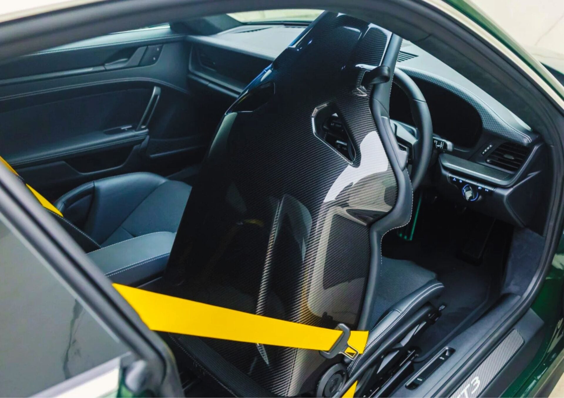 Here's something you don't see every day - carbon fibre bucket seats that fold forward. Porsche has completely redesigned the racing buckets for the 992.2, and for the first time, they're foldable. This might sound like a small detail, but it makes accessing the rear of the cabin infinitely easier.