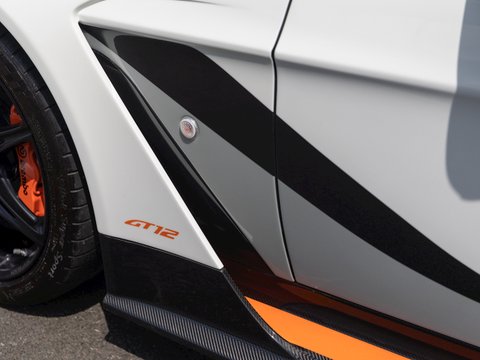 Heavily inspired by the GT3 cars, the GT12 receives a large rear wing, front splitter and wider arches ā this car has serious presence. The aesthetics have a specific function on top of the looks with the wing and splitter generating huge amounts of downforce and the wider track allowing for more grip. The real showstopper however is the sound produced by the naturally aspirated 5.9L V12. Pushing the start button awakens the beast which purrs on idle. The sound emitted from the titanium exhaust system is both aggressive and addictive, encouraging you to build up the revs and explore the torque curve.