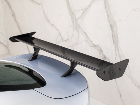 It features extensive use of carbon fibre on the front splitter, front and rear bumpers, wings, side sills, and rear diffuser. One of the most striking aesthetic features is the cutaway front wheel arch, which mimics the GTE racer. Those wishing for the most extreme aero configuration can specify the optional aero pack, which adds the large rear wing and additional corner elements to the front splitter.