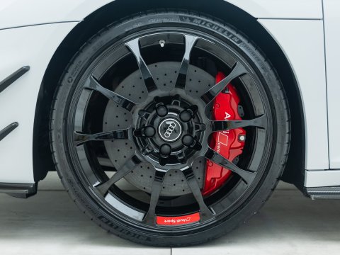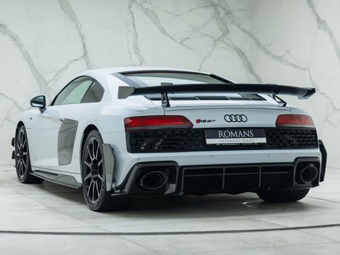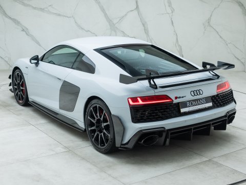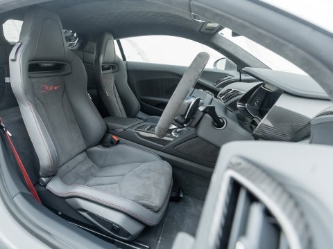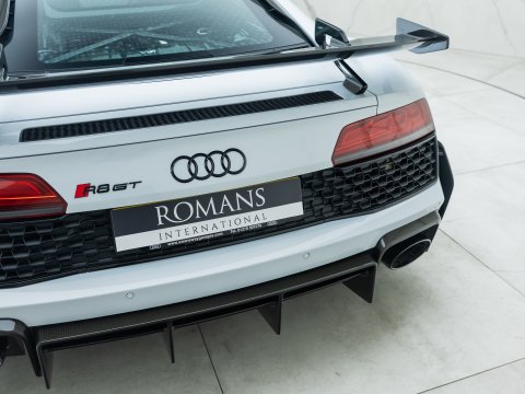 The Audi R8 GT, presented in Suzuka Grey Metallic paint, is a limited edition variant of the V10 Audi R8 Coupe with numbers limited to just 333 worldwide and 15 allocated to the UK. The GT features revised engine management software to produce 602bhp from the 5.2 litre V10, and 417 lb-ft of torque, all sent via Audi's rear-wheel drive system. All GT's are available with Audi's 7-speed dual-clutch gearbox. Weight saving measures include lightweight forged wheels, carbon fibre-reinforced-plastic anti-roll bar and performance sport suspension with aluminium components. Furthermore, Audi replaced the electric rear spoiler with a fixed carbon fibre wing. The Audi R8 GT RWD weighs 20kg less than the R8 Coupe Performance RWD.