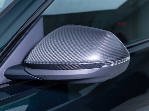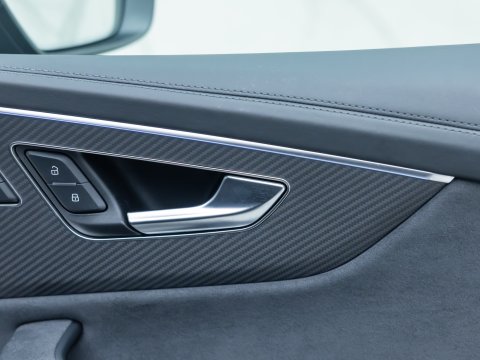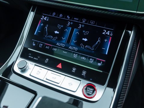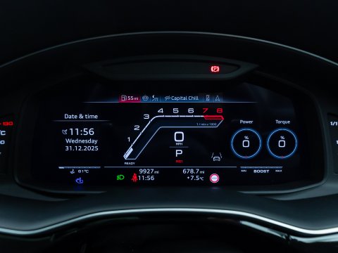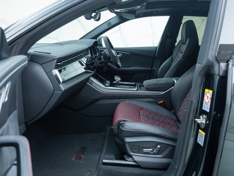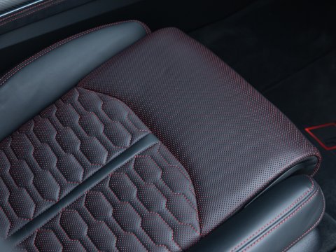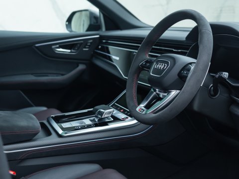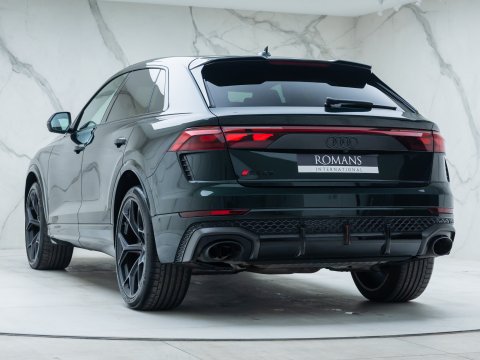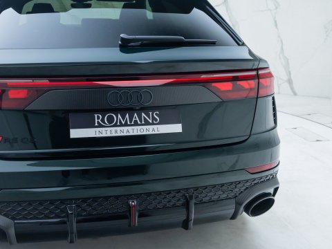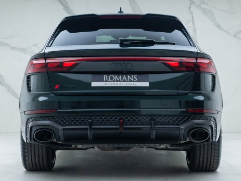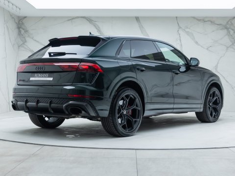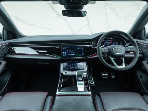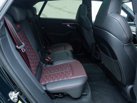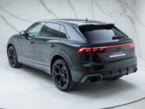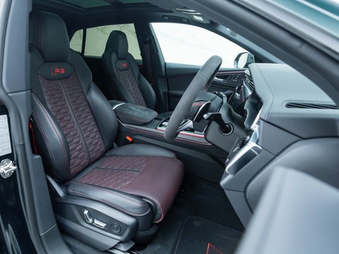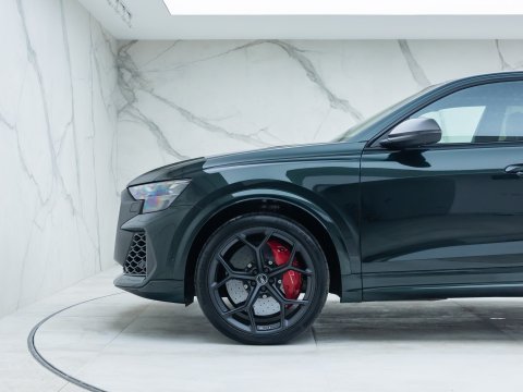 The Audi RS Q8 Performance Carbon Vorsprung is an imposing high-performance SUV that fuses brute power, luxury, and high-end styling. Under the bonnet lies a 4.0‑litre twin‑turbo V8 pumping out 632 bhp and 850 Nm of torque, enabling a 0‑62 mph sprint in just 3.6 seconds and a top speed of 174 mph. Visually, the Carbon Vorsprung packs a punch: dramatic carbon fibre detailing (grille surround, front splitter, mirror caps, vent intakes, exhaust surrounds, tailgate strip), massive 23‑inch 5‑Y‑spoke matt grey wheels, red RS ceramic brakes, and the RS Design Pack with red accents. Inside it’s just as impressive - leather seats, panoramic sunroof, full‑digital cockpit, 360‑degree camera, four‑zone climate control and a suite of driver aids and tech features.
