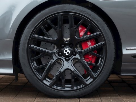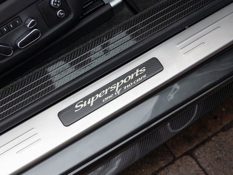 With 700 bhp and 750 lb ft of torque, this Supersports is one of the fastest GT cars money can buy. Building on the previous generations example the Supersports is 40 kg lighter than the standard car thanks largely to the carbon ceramic brakes and the optional titanium exhaust used on the GT3-R. Other noticeable differences include the carbon fibre trim, new front bumper which includes a carbon fibre splitter and the rear aerodynamic diffuser. Brightware has turned to gloss black and features on the front grille, rear bumper, door handles and window surrounds, while the headlamps and rear lights are dark tinted. Side sill extension and bonnet vents are finished in carbon fibre, the front wing vents are gloss black and so are the rifled exhaust pipe finishers. Supersports badging and 21" alloy wheels in gloss black with machined surfaces complete the dramatic performance focused look. Step inside and you are greeted with an alcantara lined interior with diamond quilting as well as embroidered Supersports emblems on the seat headrests. Overall, the Supersports is a very special car and being 1 of 710 examples worldwide means it is also highly exclusive.