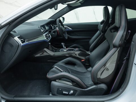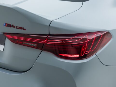 True to the CSL (Coupe Sport Lightweight) philosophy, the M4 CSL features extensive use of carbon-fibre-reinforced plastic, helping shave around 100kg off the standard M4 Competition. This includes a carbon bonnet with distinctive red stripes that extend onto the roof, showcasing exposed carbon fibre beneath. Further weight savings come from M Carbon bucket seats, a titanium exhaust, reduced soundproofing, and the removal of the rear seats.