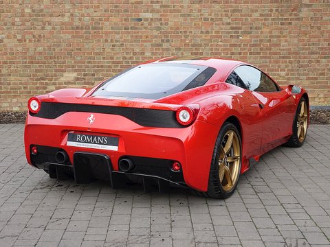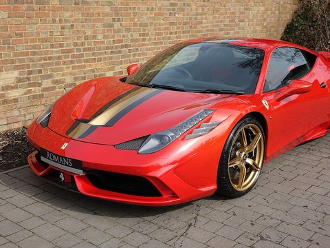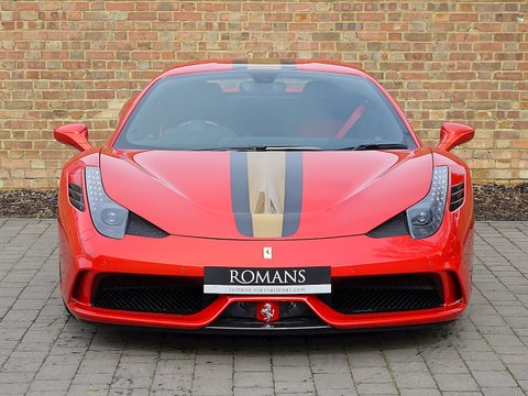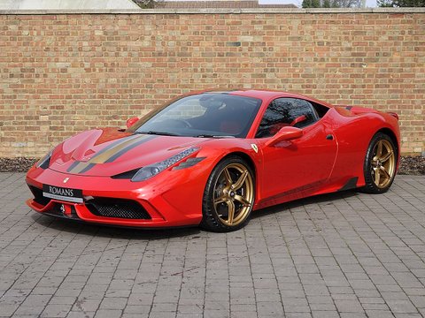 Romans are delighted to offer this beautiful 2015/65 Ferrari 458 Speciale for sale presented in 'Rosso F1 2007' Special Paint with a special Nart Livery in Canna Di Fucile Gold along with the Nero Alcantara Rosso 3D Fabric Interior. This spectacular example comes with a massive specification and is believed to be one of the biggest spec Speciale's ever to leave Ferrari Factory.The special Rosso F1 2007 paint alone cost £24/,000 and the whole car listed at £285/,000 including the £5/,000 Full Paint Protection Film (PPF) applied to the whole car by Topaz Detailing. A truly phenomenal example that is supplied with Ferrari Manufacturer's Warranty until October 2019.