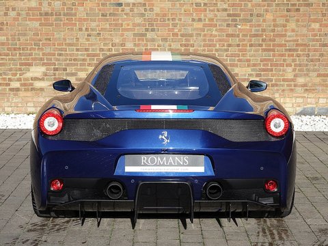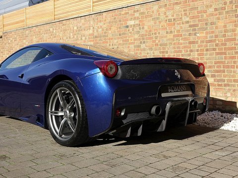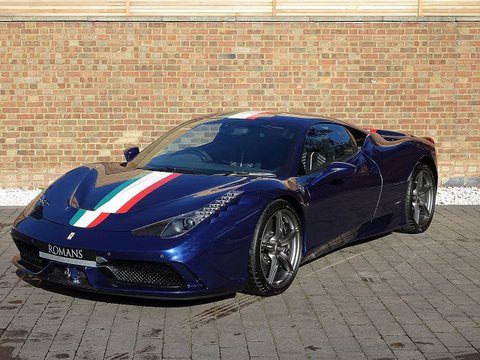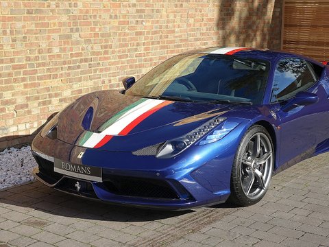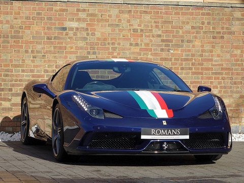 Romans are delighted to offer this beautiful 2015/65 Ferrari 458 Speciale for sale presented in 'Tour De France Blue' with Blu Scuro Alcantara Interior. This 1 owner example is by far one of the prettiest Speciale's we have ever had in stock. This car also comes with a lovely array of optional extras including the NART Racing Stripe, Large Carbon Fibre Racing Seats, Carbon Fibre Engine Cover and so much more. Furthermore, this vehicle comes with the added benefit of Paint Protection Film (PPF) applied to the front end as well as Ferrari Manufacturer's Warranty until November 2019 and Ferrari's 7 Year Free Servicing Package until November 2022.Ā