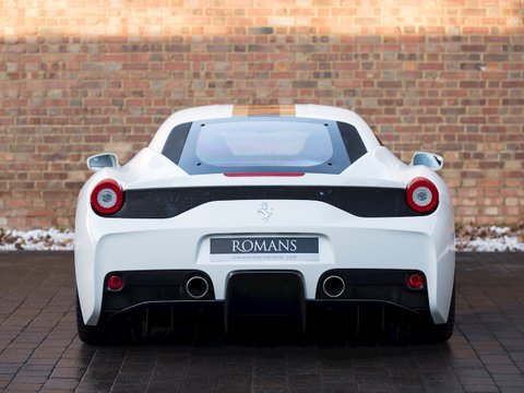 Romans are delighted to offer this stunning 2014/14 Ferrari 458 Speciale for sale presented in 'Bianco Avus' with Blu Scuro Alcantara & Nero 3D Fabric Interior. This fine example comes with a lovely array of optional extras including the all-important Nart Racing Stripe which contrasts beautifully with the 20" Forged Gold Alloys, Large Carbon Fibre Racing Seats and so much more. Furthermore, this vehicle comes with Ferrari's 7 Year Free Servicing Package until April 2021 and Ferrari Manufacturer's Warranty until April 2018.