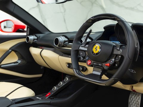 In terms of the chassis, suspension and technology the 812 Superfast feels remarkably similar to the F12tdf, which is no bad thing. Active aerodynamic flaps in the front splitter and the rear diffuser allow the 812 to develop incredible levels of active downforce without the need for a large rear wing ruining the flowing lines of the car. This is coupled with the welcome addition of four-wheel steering, giving the 812 the agility and feeling of a car with a much shorter wheelbase. Other highlight systems which have been evolved include the SSC5 (Side Slip Control 5.0) and Dual Coil MagneRide shock absorbers plus the introduction of an electronically assisted steering rack, allowing for more precise adjustments to steering feel and rate. All these different performance enhancing technologies are constantly working together to provide the optimum driving experience dependent on what mode has been selected through the F1 inspired Manettino race switch. The interior has also been enhanced and restyled over the F12 and remains one of the most driver focused and truly special interiors on the market.