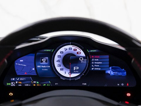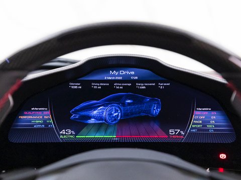 The biggest advancement here is the powertrain, now comprising of a 4.0L twin-turbo V8 and no less than 3 electric motors producing a combined output of 986bhp (1000hp). Whilst the bulk of the power comes from the V8 the electric motors contribute a healthy hot-hatched sized 217bhp. With one e-motor mounted to the engine and gearbox assisting with smoothing the torque curve and charging the battery, whilst the other two are located independently on the front two wheels making this futuristic missile of a car 4-wheel-drive. This whole system is controlled by the new eManettino haptic switch on the steering wheel opposite its analogue counterpart. The system has four modes (eDrive, Hybrid, Performance, Qualify), ranging from a silent fully electric mode good for 15 miles through to a hot-lap mode deploying the full nigh on 1000hp through all 4 wheels.