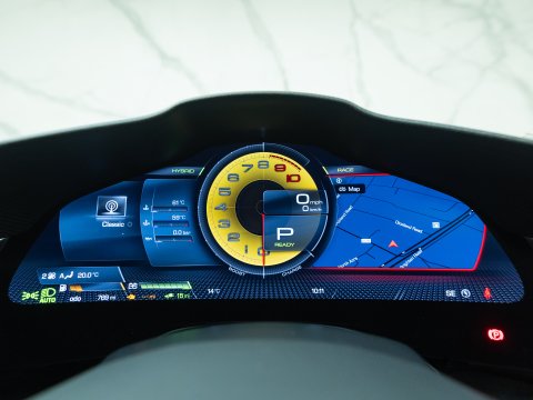 The biggest advancement here is the powertrain, now comprising of a 4.0L twin-turbo V8 and no less than 3 electric motors producing a combined output of 986bhp (1000hp). Whilst the bulk of the power comes from the V8 the electric motors contribute a healthy hot-hatched sized 217bhp. With one e-motor mounted to the engine and gearbox assisting with smoothing the torque curve and charging the battery, whilst the other two are located independently on the front two wheels making this futuristic missile of a car 4-wheel-drive. This whole system is controlled by the new eManettino haptic switch on the steering wheel opposite its analogue counterpart. The system has four modes (eDrive, Hybrid, Performance, Qualify), ranging from a silent fully electric mode good for 15 miles through to a hot-lap mode deploying the full nigh on 1000hp through all 4 wheels.