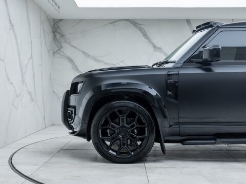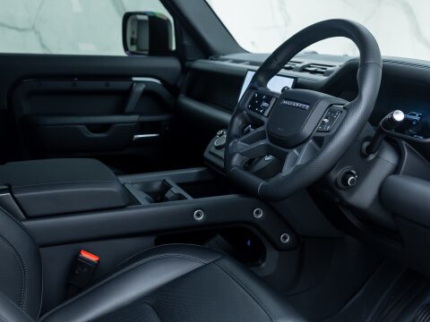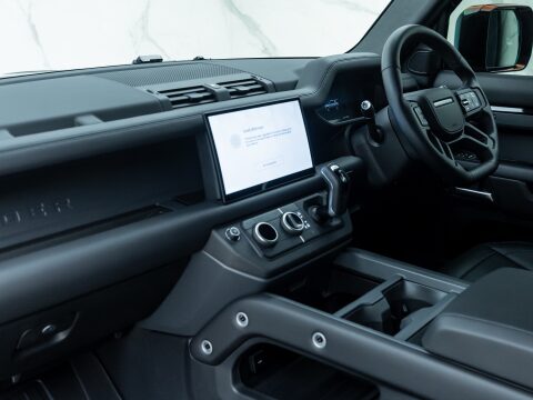 The “Hard Top” body gives it a cargo-friendly layout, and with a loadspace behind the partition of about 1,115 litres dry (or 1,355 litres wet) it’s well-suited for work or adventure. In terms of dimensions and capability: it stretches 4,583 mm in length, has a kerb-to-kerb turning circle of around 11.3m, and a braked towing capacity of up to 3,500 kg. This Defender has a 0-62 mph time of about 6.2 seconds and a top speed of 119 mph, illustrating that despite its commercial framing it still carries performance.