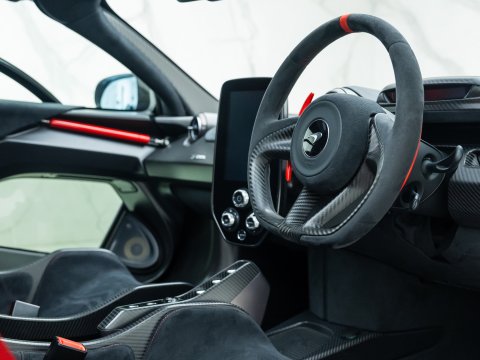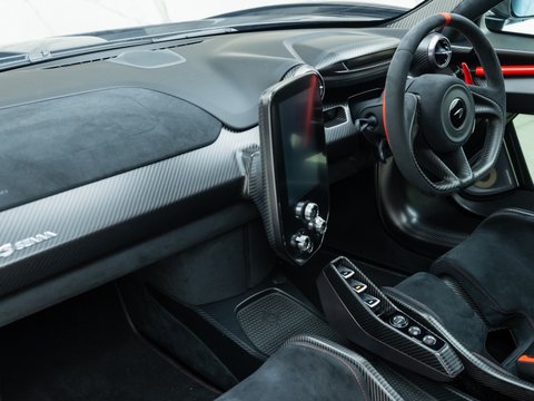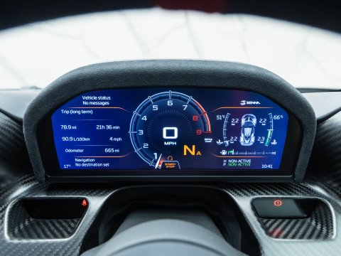 With McLaren’s 4-Litre twin-turbocharged V8 producing 789 bhp and 590 lb ft of torque (79 bhp and 47 lb ft of torque over the 720s), the Senna’s performance figures are astonishing. It does 0-62mph in 2.8 seconds, 0-124 mph in 6.8 seconds and reaches a top speed of 211 mph through its 7-Speed Dual Clutch gearbox. However, it’s the braking performance where the Senna shines thanks to its lightweight construction, active rear wing and phenomenal carbon ceramic brakes that take seven months to manufacture instead of the usual one month. From 124 mph the Senna can stop in just 100 metres; 16m less than the P1. On a track the car handles like a full on GT3 racing car partly due to its 50 mm lowered ride height in track mode. Visibility is also a stand out feature with various glass panels all over the cabin including the optional Gorilla Glass lower panel in the doors which enables you to see the track below or any kerbs should you wish to park your Senna next to one.