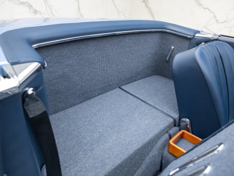 The car is finished in Bentley Silver Lake Metallic and complemented by a Rolls-Royce Navy Leather interior, with a matching blue soft top beneath a body colour-matched removable hardtop.