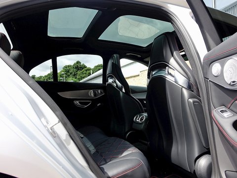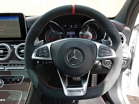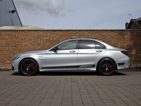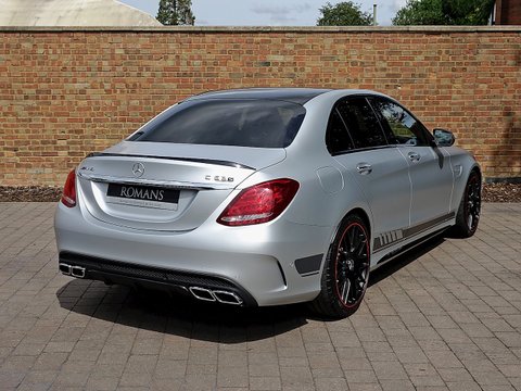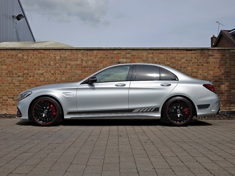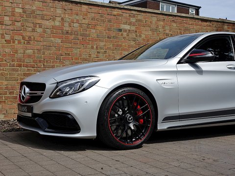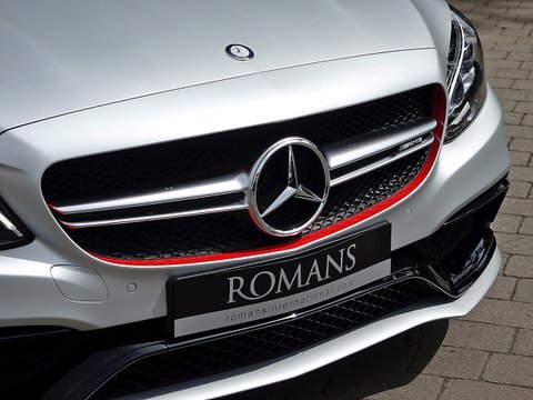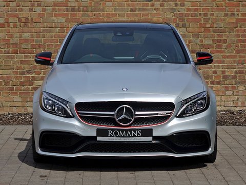 Romans are pleased to offer this exceptional 2015/65 Mercedes-AMG C63 S Edition 1 for sale presented in 'Iridium Silver Magno' with AMG Black Nappa Leather. This vehicle comes with a lovely specification and is supplied with Mercedes-Benz Manufacturer's Warranty until November 2018. The Edition 1 has a few subtle styling changes that differentiate it from the standard C63 S. Firstly the car receives red accents with in the radiator grille and on the mirror housings/, unique matte painted 19" AMG 5-Twin Spoke alloys with red lips/, Graphite Grey stripes just above the sill cladding with a high-gloss black separation edge and a carbon fibre boot lid spoiler.Step inside and the C63 Edition 1 greets you with front AMG performance seats/, Nappa leather upholstery with red diamond stitching/, flat bottom AMG steering wheel with silver-coloured aluminium shift paddles/, Designo red seat belts/, uprated Burmester stereo/, AMG floor mats with red piping/, light aluminium trim elements and carbon fibre trim. This particular example comes with the stunning red pepper carbon fibre centre console which looks sensational contrast with the black and red stitched leather. The car also receives Mercedes' Night package which includes high-gloss black mirror housings/, A-wing and trim and sill cladding inlays/, silver chrome radiator grill with double fin and heat-insulating tinted glass behind the B-pillar.Under the bonnet the Edition 1 receives the same mind-blowing 4.0L twin-turbocharged V8 engine used in the standard C63s which produces 510bhp and 516lb ft of torque. 0-62mph is dealt within 4.0 seconds and limited to a top speed of 155mph.