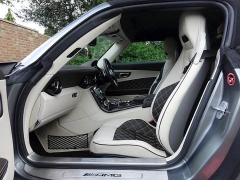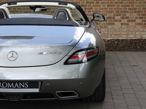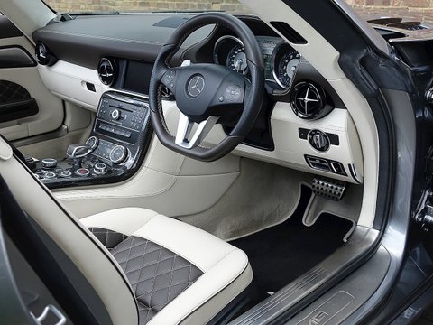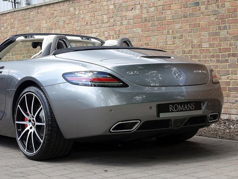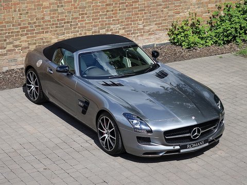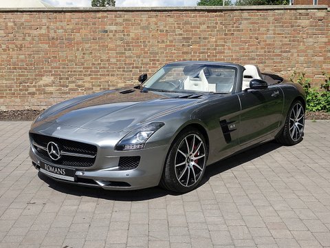 Ā Romans are pleased to offer this beautiful 2014/63 Mercedes SLS AMG GT Roadster for sale presented in 'AMG Imola Grey' with Two-Tone Mocha Brown/Porcelain Designo Exclusive Leather. This is believed to be 1 of just 2 SLS GT Roadsters that were built for the UK market making it one of the rarest and most sought-after convertibles around.Various features distinguish the SLS AMG GT Roadster from the normal SLS AMG Roadster. Among the changes include a more efficient and powerful naturally aspirated 6.2-Litre V8 producing an added 18 bhp to total 581 bhp. Accompanying the boost in power is a reworked seven-speed gearbox that uses new software for improved shift times. Most of all/, it is the changes brought to the suspension that help define the hardened character of the SLS GT Roadster. The GT model is stiffer as it features increased springs and damping rates.Further exterior changes include the darkened headlights and taillights/, high gloss finish grille/, exterior mirror housings and bonnet fins/, red brake calipers and GT badging. Step inside and you are greeted with lightly restyled instruments/, diamond quilted leather interior trim and alcantara.We believe the SLS to be a modern day classic as it will be one of the most remembered and desirable Mercedes in years to come. It is a great investment opportunity and it's no surprise that we are seeing many collectors purchasing the best examples with an eye on it's future value.