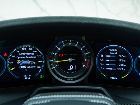 Lightweight construction and Porsche’s incredible attention to detail creates an unmatched handling capability, with notable and unique performance upgrades to the front suspension, making it the first of its kind in this 911 series. The 992’s airflow management has been optimized, alongside a drag-reduction system comparable to those in Formula 1 Race Cars, which activates above 62mph and 95% throttle and can also be activated via the DRS button on the steering wheel. Its simple interior layout pays homage to past iterations of Porsche’s classic sports car. Yet, it does not come without its own unique characteristics such as extra steering controls for adjusting the adaptive dampers and compression levels.