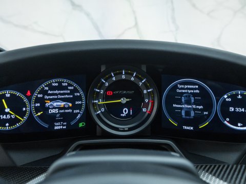 Lightweight construction and Porsche’s incredible attention to detail creates an unmatched handling capability, with notable and unique performance upgrades to the front suspension, making it the first of its kind in this 911 series. The 992’s airflow management has been optimized, alongside a drag-reduction system comparable to those in Formula 1 Race Cars, which activates above 62mph and 95% throttle and can also be activated via the DRS button on the steering wheel. Its simple interior layout pays homage to past iterations of Porsche’s classic sports car. Yet, it does not come without its own unique characteristics such as extra steering controls for adjusting the adaptive dampers and compression levels.