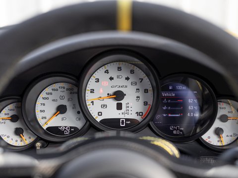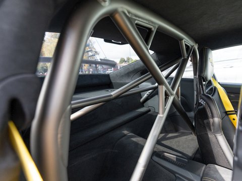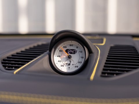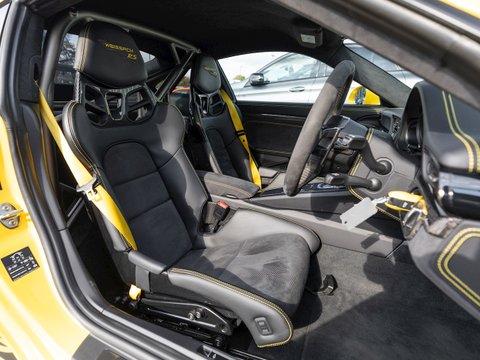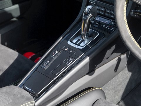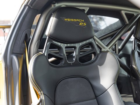 Focusing on weight saving the engineers at Weissach have managed to shave 18kg off the weight of a Clubsport specification GT3 RS. This has been done primarily using a carbon fibre roof and a new titanium roll cage to replace the heavier steel one included with the Clubsport Pack. Saving weight this high up in the car gives the added benefit of lowering the centre of gravity, reducing roll whilst aiding overall braking, acceleration and turn-in performance. Stiffness and further weight reduction have also been achieved through the use of carbon fibre anti-roll bars & drop links, whilst sound deadening has been reduced as well as interior trim and carpeting cut back. The only weight that has been added is that of the Weissach logo embroidery in the headrest and plaque on the cupholder cover, that gently remind you that you are sitting in something truly special. Overall the Weissach Pack creates a GT3 RS that feels sharper, more alert and meaner looking than ever.