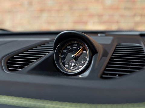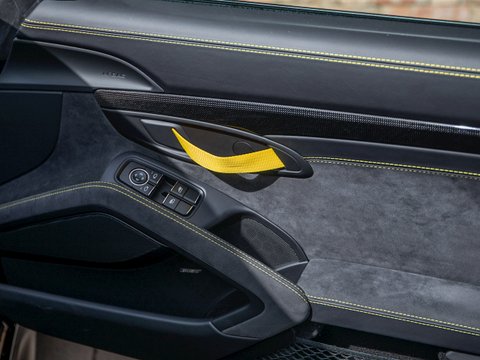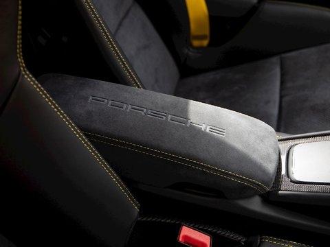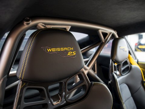 Focusing on weight saving the engineers at Weissach have managed to shave 18kg off the weight of a Clubsport specification GT3 RS. This has been done primarily using a carbon fibre roof and a new titanium roll cage to replace the heavier steel one included with the Clubsport Pack. Saving weight this high up in the car gives the added benefit of lowering the centre of gravity, reducing roll whilst aiding overall braking, acceleration and turn-in performance. Stiffness and further weight reduction have also been achieved through the use of carbon fibre anti-roll bars & drop links, whilst sound deadening has been reduced as well as interior trim and carpeting cut back. The only weight that has been added is that of the Weissach logo embroidery in the headrest and plaque on the cupholder cover, that gently remind you that you are sitting in something truly special. Overall the Weissach Pack creates a GT3 RS that feels sharper, more alert and meaner looking than ever.