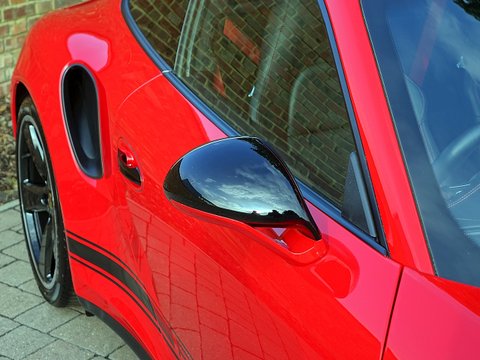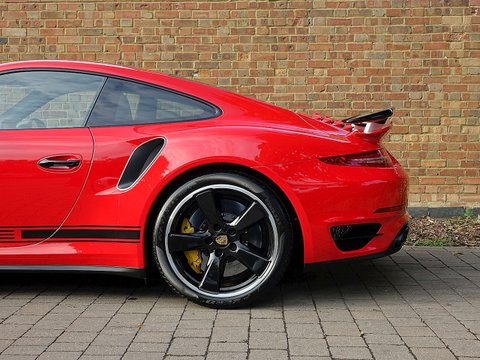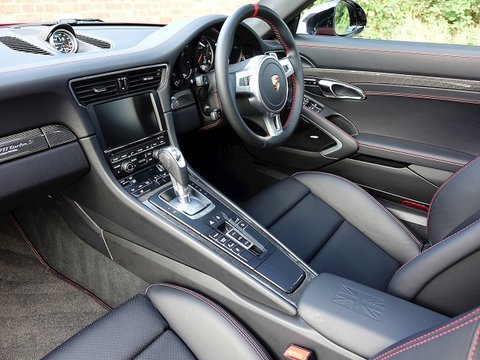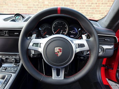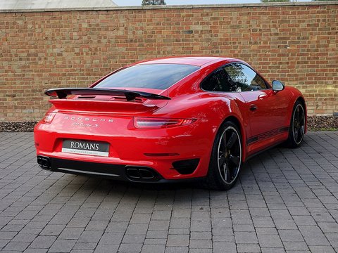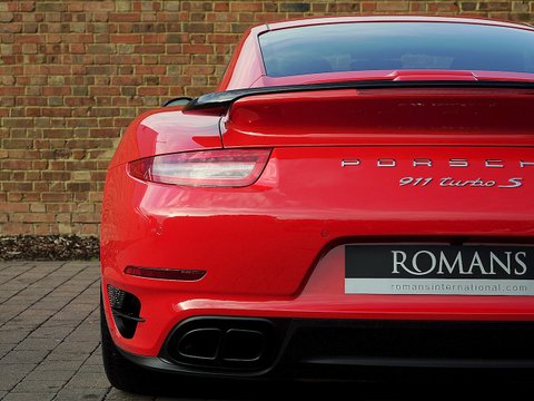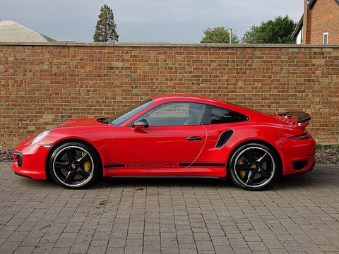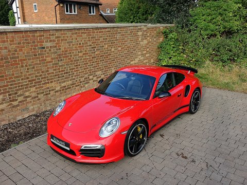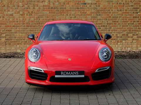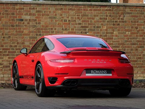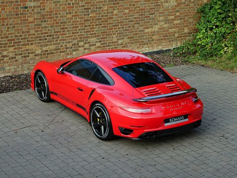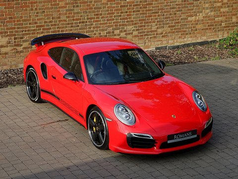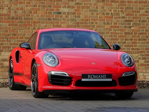Romans are pleased to offer this stunning 2014/64 Porsche 911 (991) Turbo S GB Edition for sale presented in 'Guards Red' with Black Leather Interior. This fine rare example comes with a fantastic specification and is supplied with Porsche Manufacturer's Warranty until December 2017.Produced by the exclusive department at Weissach; the 991 Turbo S Exclusive GB Edition is a very special car. Built to celebrate the four decades since the arrival of the legendary Porsche 930, production of this unique 991 Turbo S was limited to just 40 UK cars.The Exclusive GB Edition was only available in a choice of three classic Porsche colours: GT Silver, Guards Red and White, while the black leather interior features a number of personalised touches courtesy of Porsche Exclusive.The Sport Design wheel features a Guards Red centre marking, with similarly coloured contrast stitching, while carbon interior trim is lavished over the Turbo's cockpit. Guards Red floor mats are a throwback to the original 1974 Porsche 911 Turbo, while the seatbelts also get the rouge treatment. The centre storage lid gains a union flag embossing.On the outside, the plethora of black trimmings, including the upper rear wing section, door handles and the Sport Classic wheels have been chosen to evoke the look of the classic 930, unveiled to the world forty years ago.Mechanically, the car is the same as the standard 991 Turbo S with Sport Chrono PackageĀ Plus, Porsche Carbon Ceramic Brakes and Porsche Dynamic Chassis Control all coming as standard.