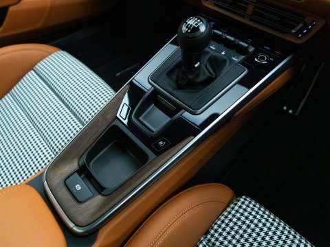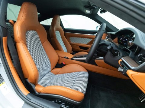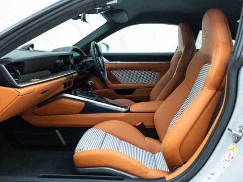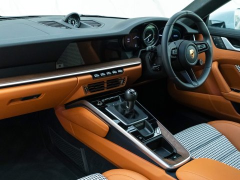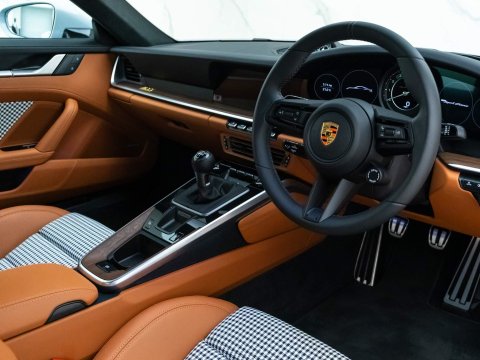 The interior features open-pored wood dash and of course the iconic Pepita houndstooth in the doors and seats. The ducktail spoiler, painted stripes and bespoke carbon fibre roof set this car apart from any standard 911, but its driving capability is certainly Porsche. The manual transmission allows the driver to be truly in control on spirited drives, whilst also providing a nostalgic representation of how 911s would drive in the past, yet with the speed and capability of the latest 992 generation. The combination of this carās driving abilities and style creates a finely tailored Porsche experience of a different kind. It is evident that this car is extremely deserving of the Sport Classic name.