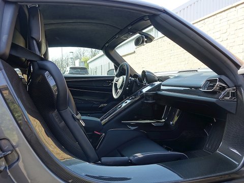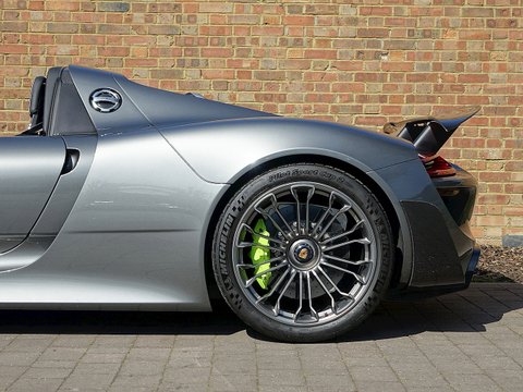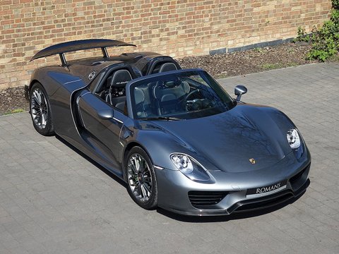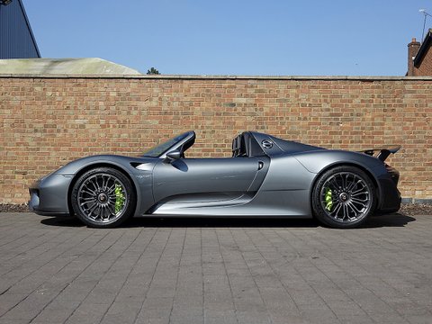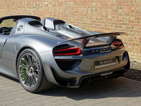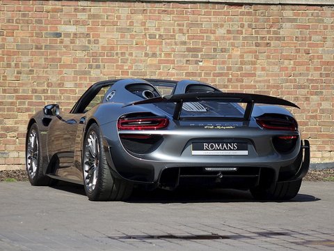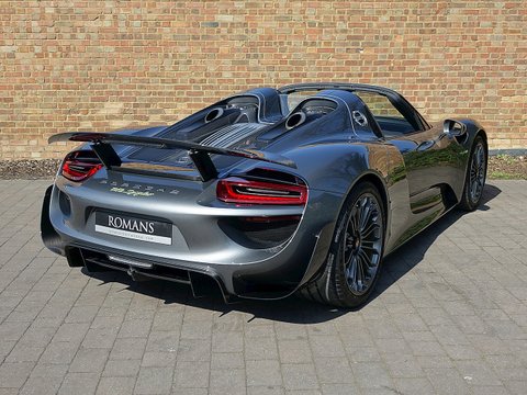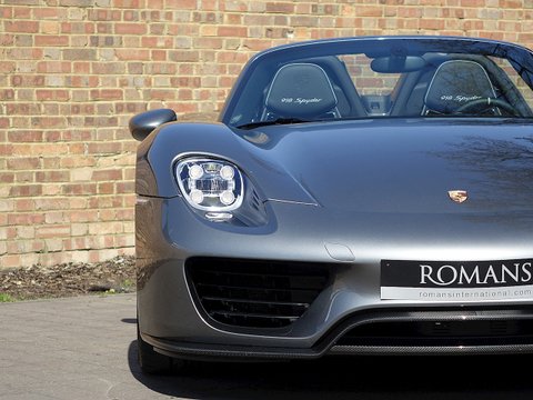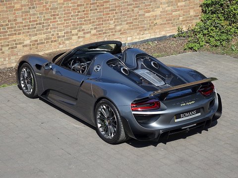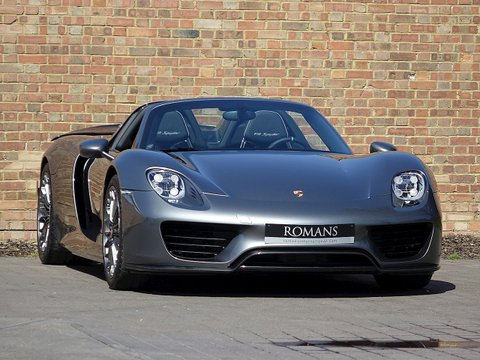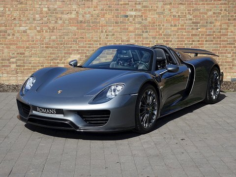 Romans International are proud to offer this spectacular 2015/15 Porsche 918 Spyder for sale presented in 'Meteor Grey' with Onyx Black Leather Silver Piping. This exquisite UK Supplied example comes with a massive specification including the Carbon Fibre Rear Spoiler/, Carbon Fibre Rear Lower Spoiler/, Carbon Fibre Rear Deflectors and Front Weissach Deflectors which were all fitted by Porsche costing £14/,447.99. Furthermore/, this car has just been serviced by Porsche and comes supplied with Porsche Manufacturer's Warranty until July 2018. We believe this to be one of the best 918 Spyders on the market today with the stunning Meteor Grey paint and all the carbon fibre options all resulting in a fantastically aggressive looking machine. Finally/, this vehicle is physical to buy today.The Porsche 918 Spyder has re-written the hypercar rulebook. Producing a staggering 887bhp and 944 lb ft of torque from it's naturally aspirated 4.6 litre V8 engine coupled with two electric motors has resulted in the fastest ever road going Porsche. The 918 accelerates from 0 to 62 mph in just 2.5 seconds and reaches a top speed of 214mph. Furthermore/, this astonishing car can lap the famous Nurburgring race track in under 7 minutes. The 918 Spyder is a masterpiece of engineering that combines the best of hybrid technology with motorsport heritage.