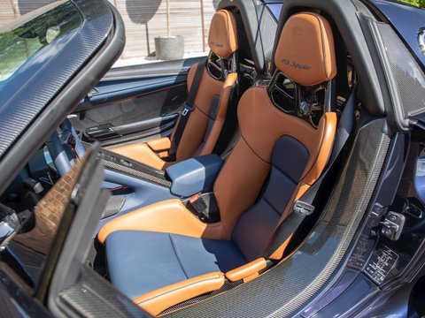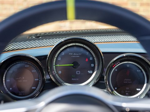 On their most hardcore cars such as the GT2 RS, GT3 RS and this the 918 Spyder, Porsche offer performance-oriented packages named after Weissach, where Porsche's research and development centre is based. The £60,000 Weissach Pack option box on the 918 Spyder specification sheet was ticked on approximately 25% of the cars which left the factory, making these cars even rarer and more desirable. This Nurburgring developed pack is all about shaving weight using features such as lightweight Magnesium wheels, titanium chassis bolts and plenty of carbon fibre. Aerodynamics are also improved with a front splitter and rear aero fins in exposed carbon fibre to compliment the roof and windscreen surround. Other highlight features include the grab handles which have replaced the heavier door handles and racing harnesses for both seats to keep you firmly planted.