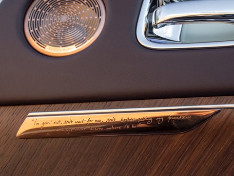 The front headrests have received Ronnie Wood’s unique and beautifully embroidered signature, whilst the rear centre waterfall has been adorned with artwork by Ronnie Wood himself, inspired by the cover of his seventh solo studio album ‘I Feel Like Playing’ (2010). The copper door flights are engraved with lyrics from ‘I Gotta See’ taken from the same album and really set this car apart as a truly special example. Other stand out features include the “Ronnie Wood” engraved door sills and base of The Spirit of Ecstasy. Overall this highly collectable one-off car presents a rare opportunity for Ronnie Wood and Rolls-Royce enthusiasts alike.