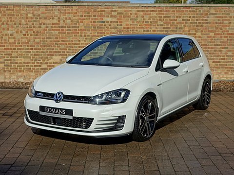 Romans are proud to offer this 2014/14 VW Golf GTD 2.0 TDI for sale presented in 'Oryx White' Special Pearlescent Paint with Titan Black Interior. This lovely 1 owner example comes with a big specification including the Discover Navigation Pro, Panoramic Sunroof and Pearl Effect Paint and is supplied with VW manufacturer's warranty until 2017.